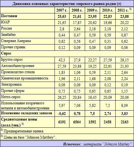 На мировом рынке родия в 2011 г. вновь наблюдался избыток поставок металла, составивший, по оценке "Johnson Matthey", 3,83 т по сравнению 3,54 т в 2010 г. и 7,50 т в 2009 г.