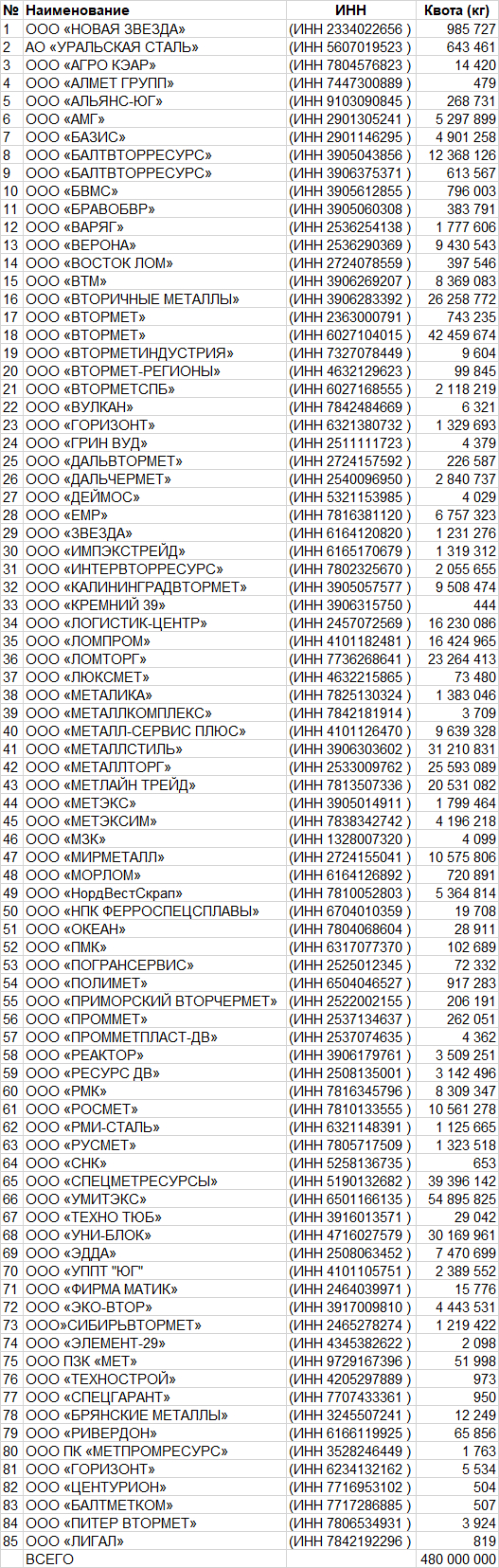 Распределение тарифной квоты на вывоз металлолома за пределы территории РФ
