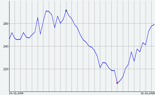 | Дата | 10.10.25 | 17.10.25 | 24.10.25 | 31.10.25 | 7.11.25 | 14.11.25 | 21.11.25 | 28.11.25 | 5.12.25 | 12.12.25 | | Цена | 25769.0 | 24834.0 | 25721.0 | 24875.0 | 25453.0 | 25645.0 | 25538.0 | 25307.0 | 25180.0 | 25395.0 |