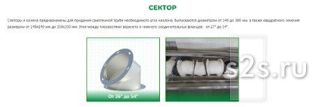 Секторы и колена предназначены для придания самотечной трубе необходимого угла наклона. Выпускаются диаметром от 140 до 380 мм, а также квадратного сечения размером от 140x140 мм до 350x350 мм. Угол между плоскостями верхнего и нижнего соединительных фланцев - от 27° до 54°.
