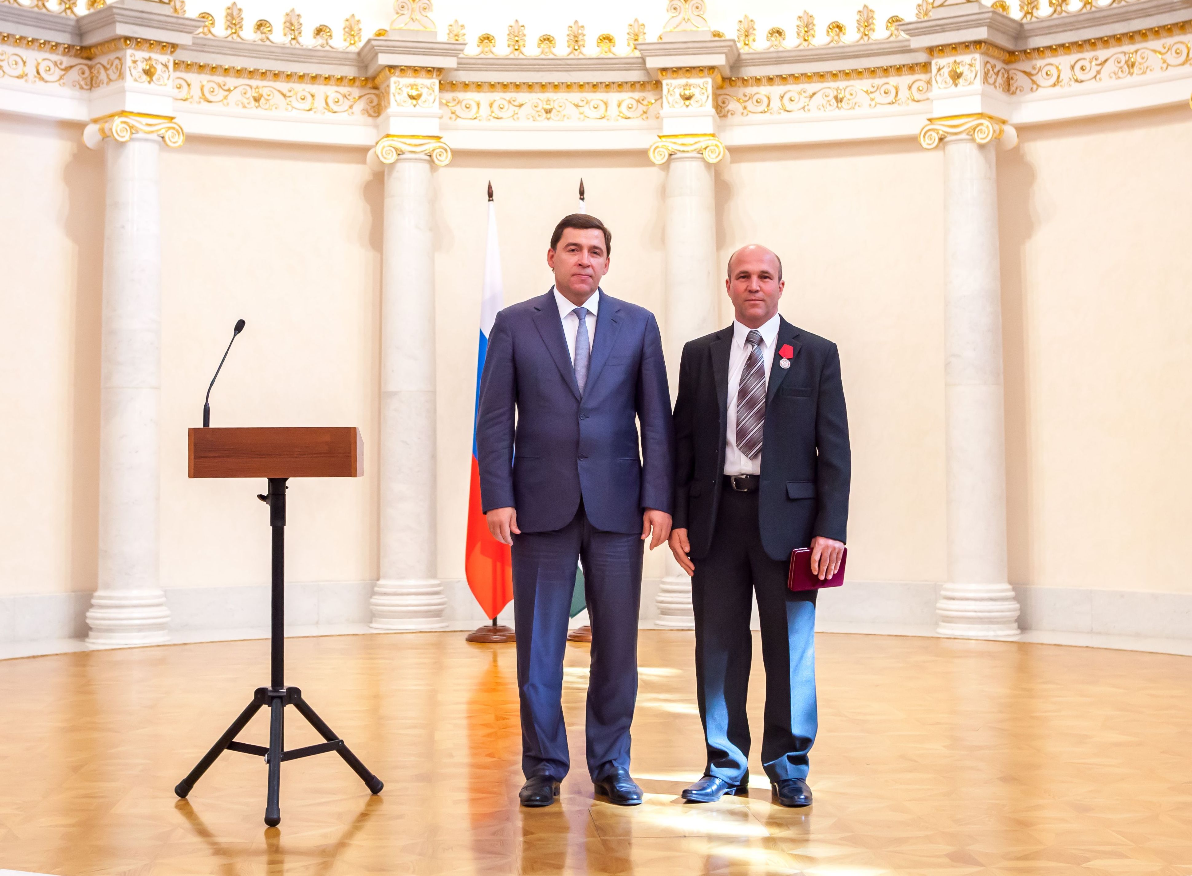Начальник группы обеспечения производства трубоволочильного цеха ПНТЗ Раушан Фаузетдинов с губернатором Свердловской области Евгением Куйвашевым.jpg